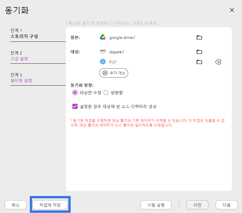 - 전송 완료 후 AWS S3와 Google Drive에서 파일이 정상적으로 동기화되었는지 확인합니다.